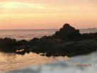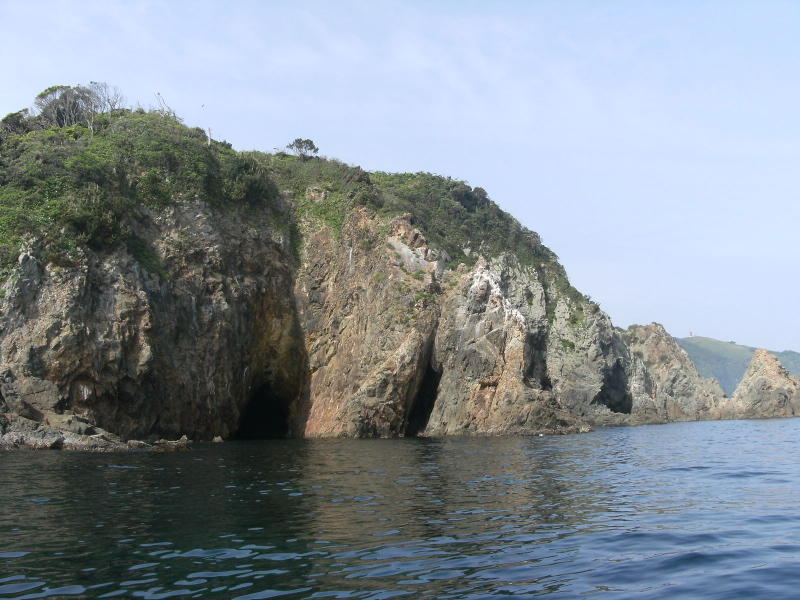 画島の循環道路にかかる"いざり日橋"から眺める岩瀬 海岸。橋の上からは天気にもよりますが世界遺産"沖の 島"を望む事ができます。 左手の岬のつけ根には沖ノ島に行けない人々のための "沖津宮遥拝所があり島の観光バスの停留所もありま す。" |