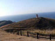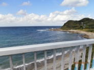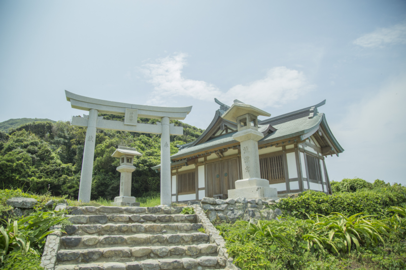 小屋から海岸道を200m進むと岬の付根に"沖ノ島"が拝めるる「沖津遥拝所」 があり傍にはバス停もある